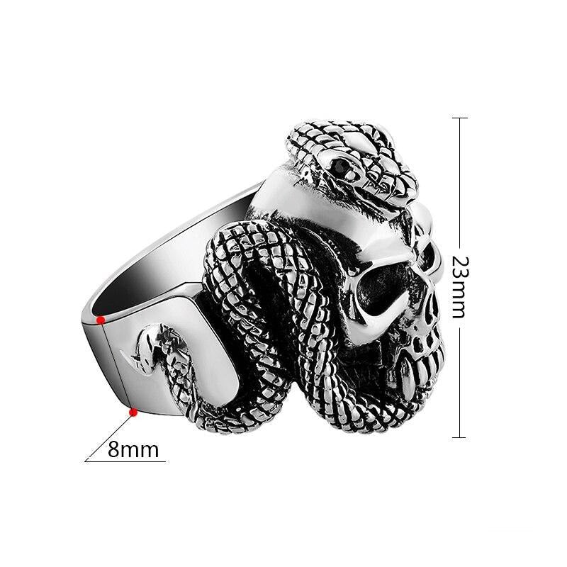 Este anillo ha sido moldeado y tallado con cuidado para resaltar una calavera y una serpiente. Estos dos símbolos significan: