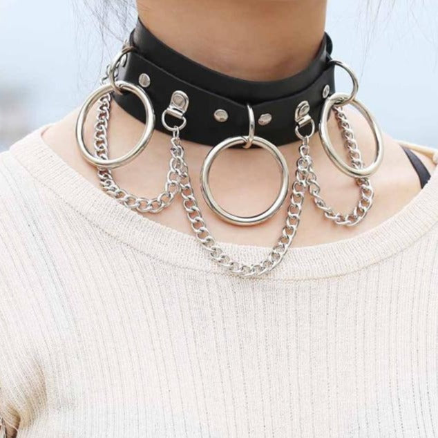 Este collar gótico ajustado al cuello y adornado con anillos metálicos es ideal para afirmar tu audacia. Su aspecto sexy y alternativo combina perfectamente con un atuendo de estilo oscuro. Una correa ajustable está disponible para poder ajustar la presión del collar gótico alrededor del cuello.