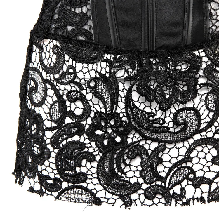 Corsé Negro de Imitación de Cuero con Encaje Floral – Estilo Burlesque