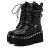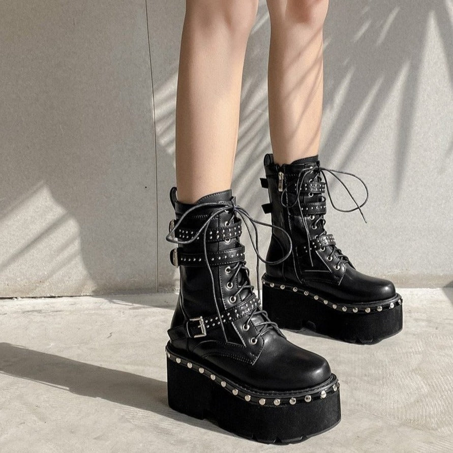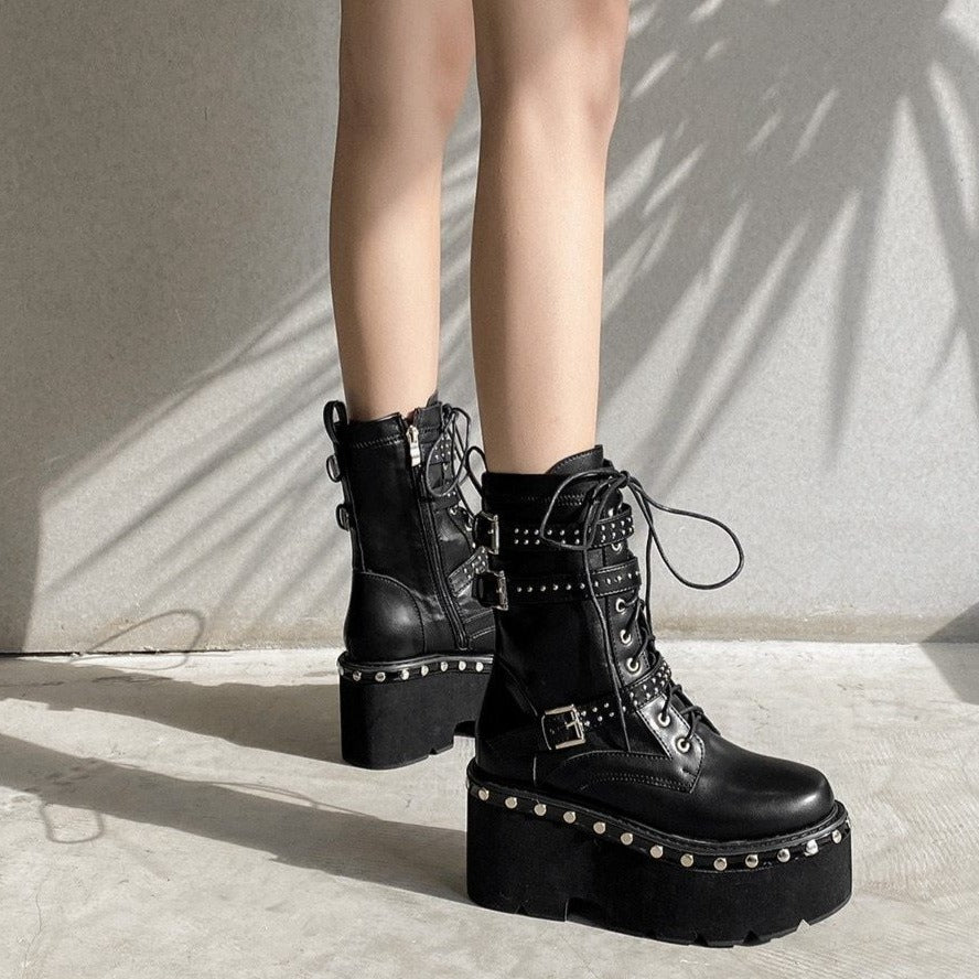 Las botas de estilo gótico son únicas en su género. Altas, serán ideales en tiempo de lluvia o frío. Poseen suelas gruesas con plataforma, lo que es óptimo para durar mucho tiempo. Sus cordones suben para tener un ajuste ideal en los pies y los tobillos. Para añadir un elemento decorativo y provocador, se han incorporado tres correas de cuero sintético. Esto permitirá añadir un toque de belleza oscura.