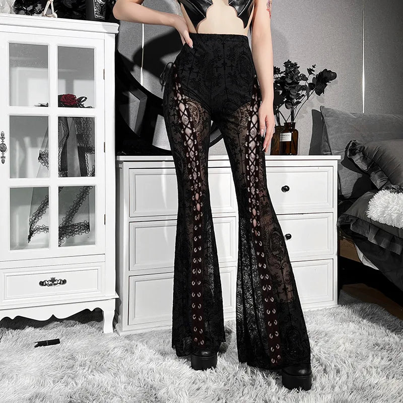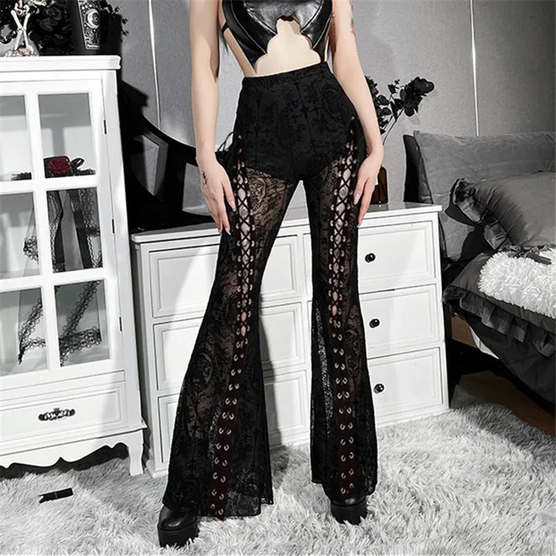 Pantalones góticos acampanados de encaje negro estilo dark mall