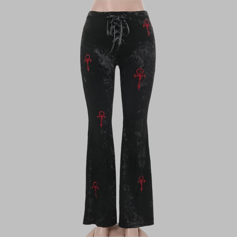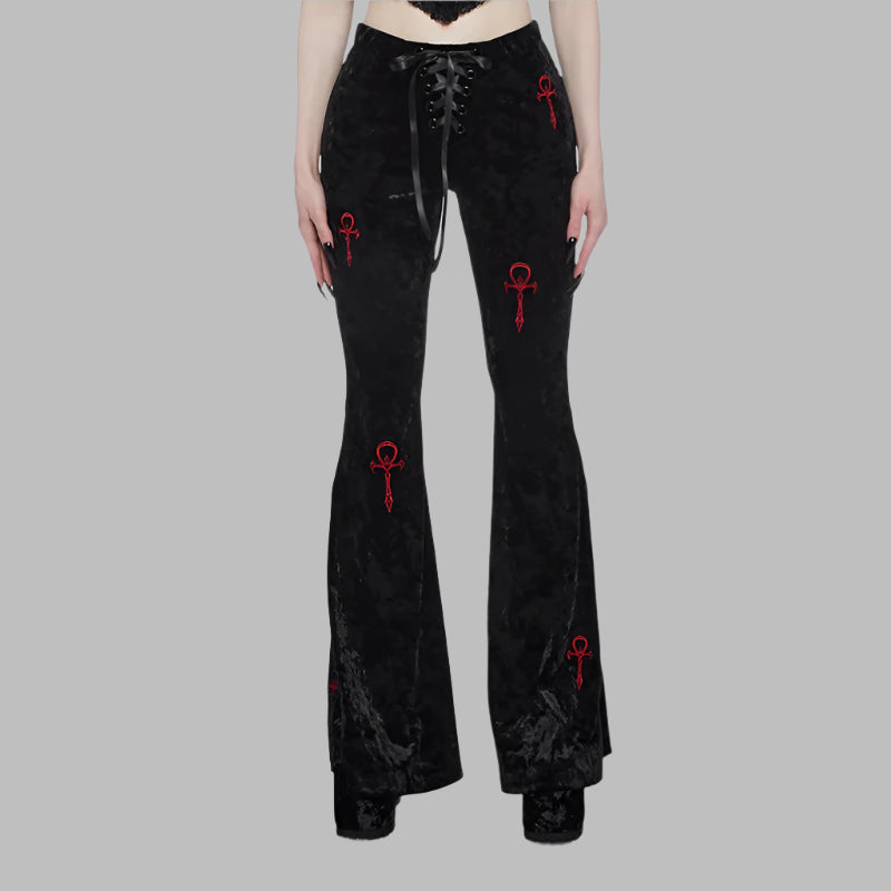 Pantalón gótico de terciopelo negro de talle alto con cruces rojas bordadas