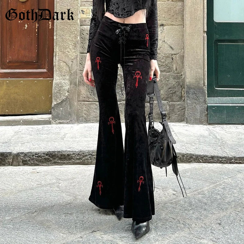 Pantalón gótico de terciopelo negro de cintura alta con cruces rojas bordadas