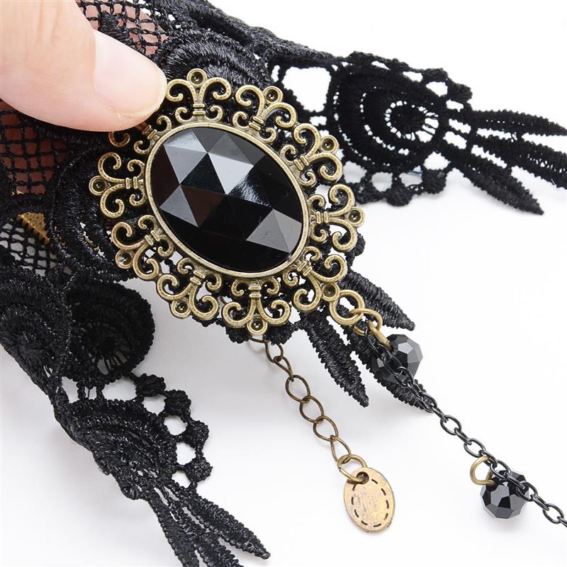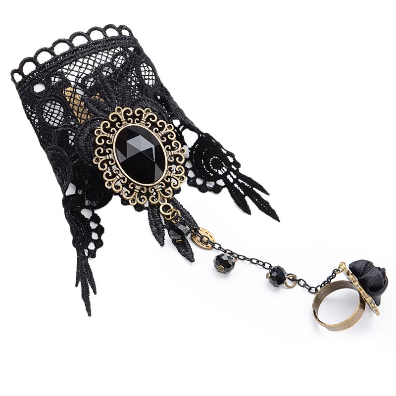 La gran particularidad de esta joya gótica es su rareza. Presenta un diseño que es a la vez un brazalete y un anillo gótico. Para tener un confort óptimo y una belleza elegante, el brazalete está hecho de encaje negro de estilo victoriano. En cuanto al anillo, está adornado con una rosa del mismo color que el encaje, lo que crea una bonita armonía oscura.