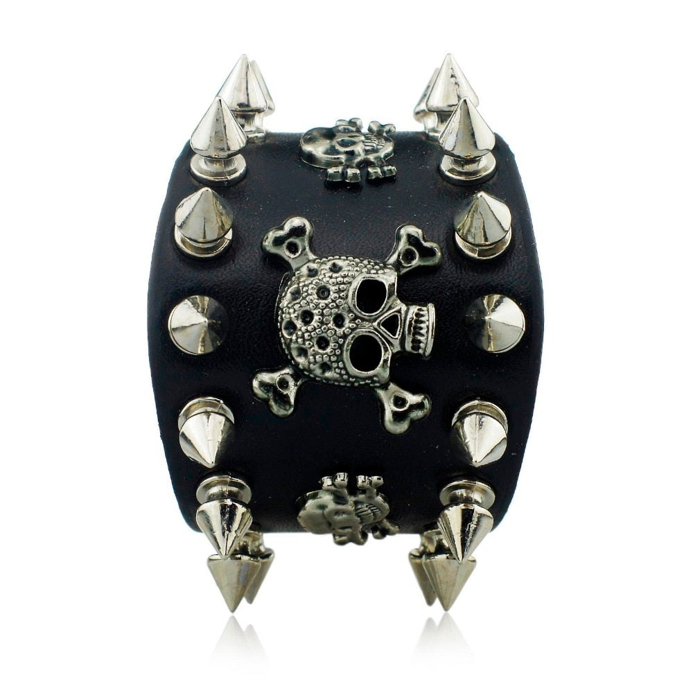 El brazalete gótico calavera es una joya ancha hecha de cuero sintético negro adornado con numerosas púas de metal. Además, tres calaveras talladas en metal añaden un toque oscuro y alternativo al brazalete.