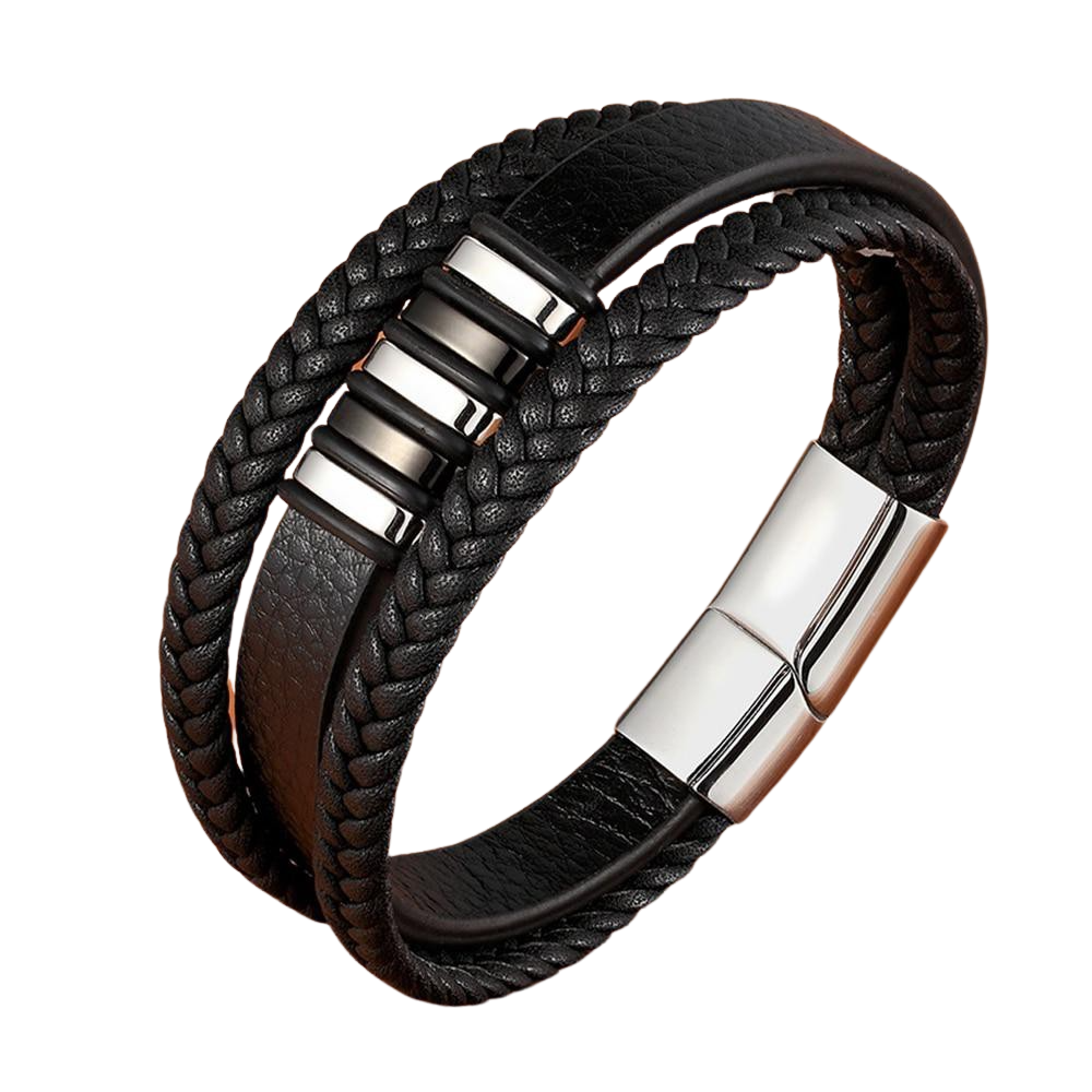 El brazalete gótico negro es un modelo simple y minimalista que destaca los detalles y el trenzado que lo compone. Varios adornos de metal plateado contrastan con el negro y añaden un toque de novedad.